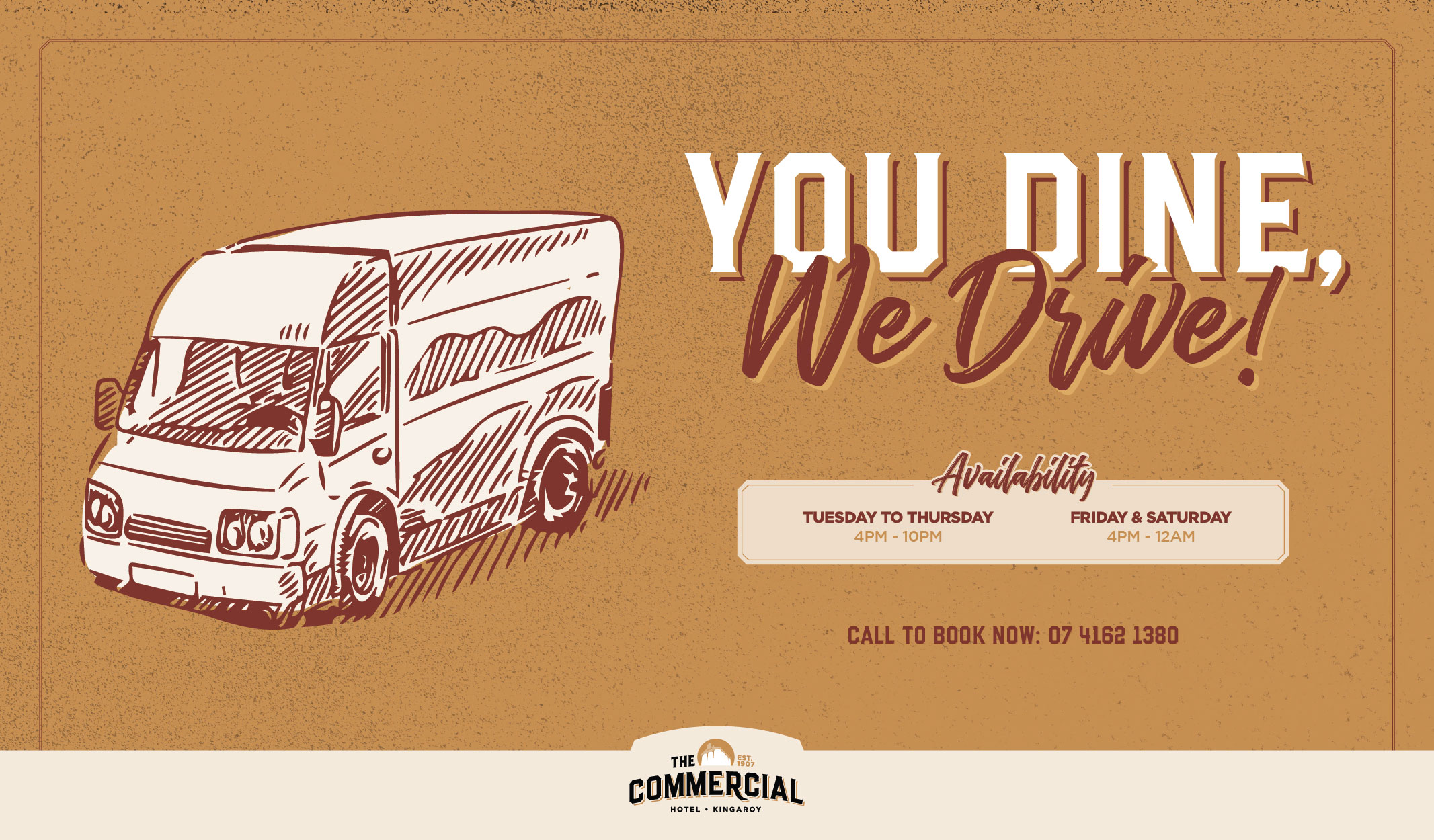 Need a lift home after a few knock-off beverages? Think smart and take the Commercial Hotel Kingaroy’s courtesy van which is available for pickups & drop-off services Tuesday to Thursday from 4pm to 10pm and Friday and Saturdays from 4pm until 12am.